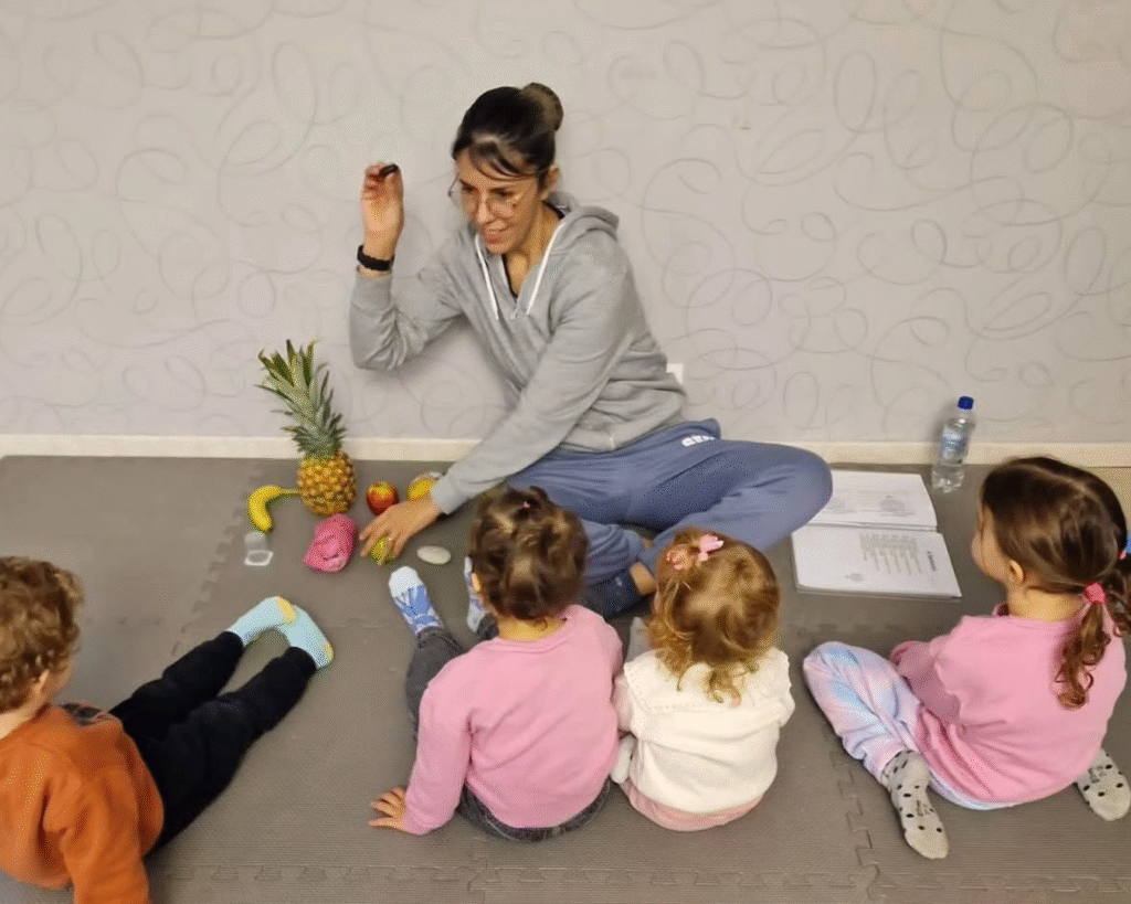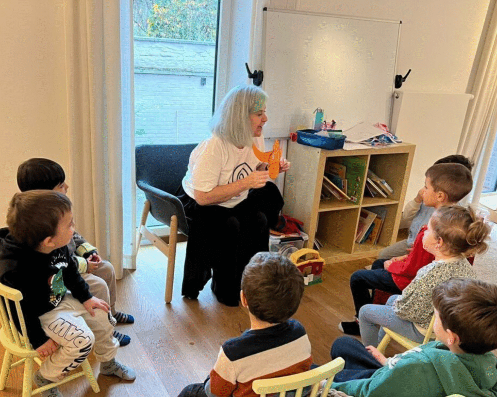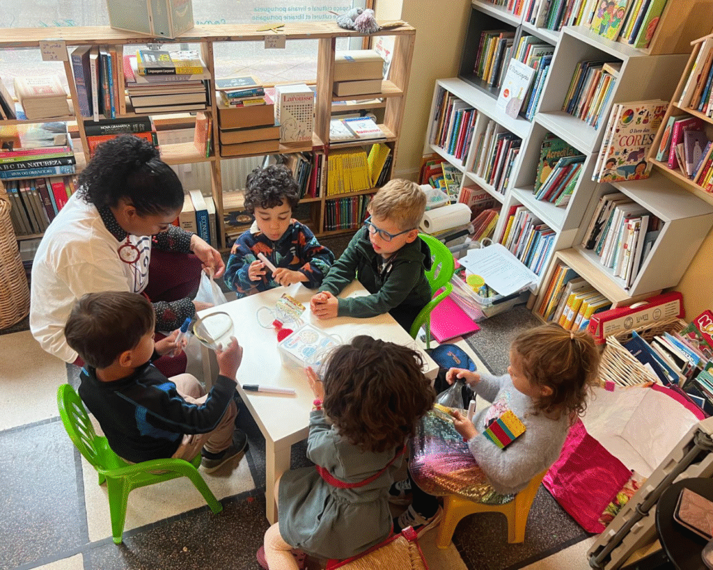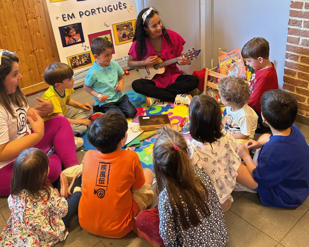 Encontros quinzenais com metodologia lúdica. Brincar, cantar, desenhar e conversar: nossas aulas presenciais são momentos de conexão e carinho — onde cada palavra em português ganha significado na vivência.
